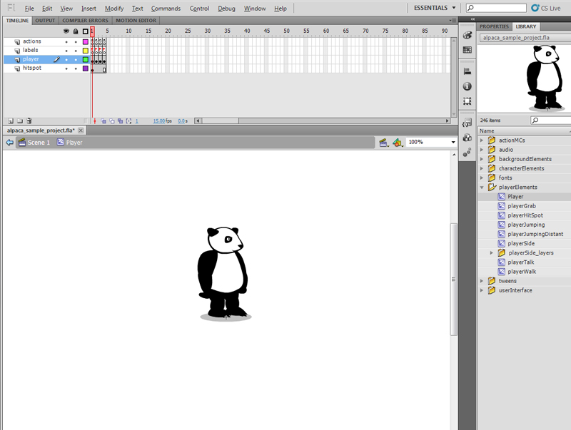 That's Al the Panda, our protagonist for this game. Note that his name in the library is capitalized. That's because Player is not just a movie clip in this .fla file, but a class. Right-click on Player in the Library and select "Properties" to see what that means.