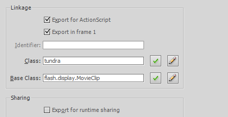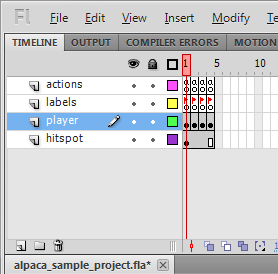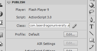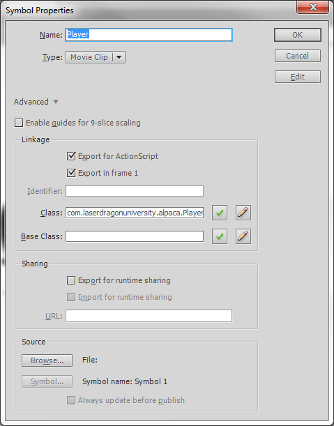 Note that "Export for Actionscript" is checked. This is vital. If you don't check this box, you won't be able to call up an element from your library using code. Actionscript will be completely blind to its existence. Note also that the Class dialog contains com.laserdragonuniveristy.alpaca.Player. This is likewise vital - it means that this movie clip is joined at the hip with the file com/laserdragonuniversity/alpaca/Player.as. That .as file defines all the Player's attributes and functionality.