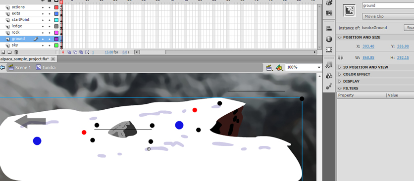 Back in the tundra clip, let's look at the ground movie clip on the layer of the same name. This defines the area on which the player can walk. Every background needs a ground movie clip. This clip doesn't require anything special, just the proper instance name.