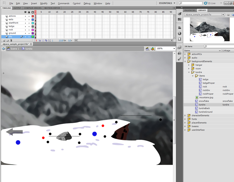 Why is that? Well, tundra is just a regular movie clip, and it has no corresponding class / .as file. The backgrounds are all controlled by a class called Background.as, which loads these movie clips from the Library. We could make each background its own class if we wanted, but that would lead to a lot of duplicate code and some major headaches if we needed to change something. So I've kept things simple.